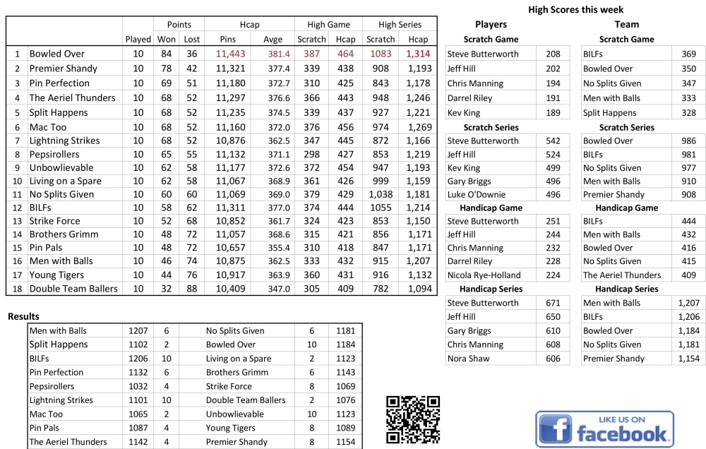 Bowled Over continue at the top with another win, 10-2 against Split Happens and increase their lead over Premier Shandy to six points. Behind these two there is a nine point gap to five teams on 69 or 68. Pin Perfaction rise to third from sixth with a close match with Brothers Grimm. Steve Butterworth in lane 24 and Jeff Hill in lane 7 both had excellent matches tonight - their highest scores and their first time over 500 in any Monday League. Steve scored 542 (671 with handicap) which was an improvement of 90 on his previous high this season.and Jeff hit a 524 series (650), 34 higher than his best this season. They were the only players with 200 games: Steve scored 208 (251, second best of the league so far) and Jeff hit 202 (244, fourth best this year). Carl Briggs improved his high series by 7 to 496 (610). Nora had another good week and her high series rose by 21 to 438 (606).