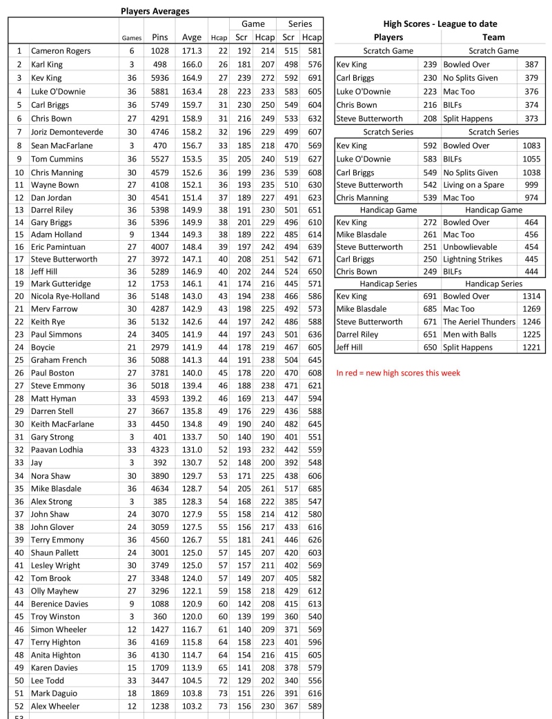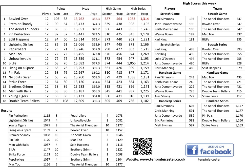 First and second, Bowled Over and Premier Shandy, both won 10-2 tonight so keep their positions with the same 16 gap. The big change is The Aeriel Thunders who took 10 points from their scheduled match and ten from their back match to jump from sixth to third, just two points behind Premier Shandy.