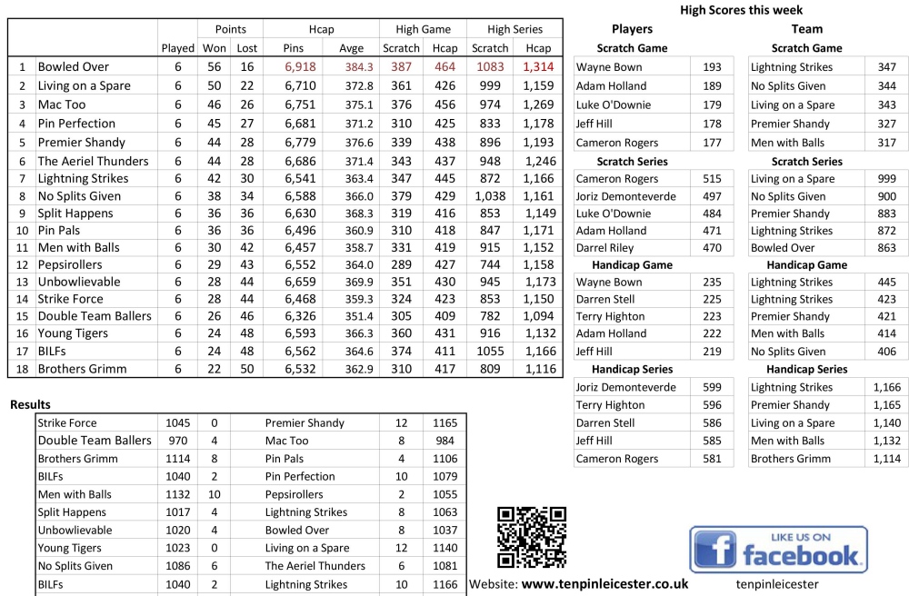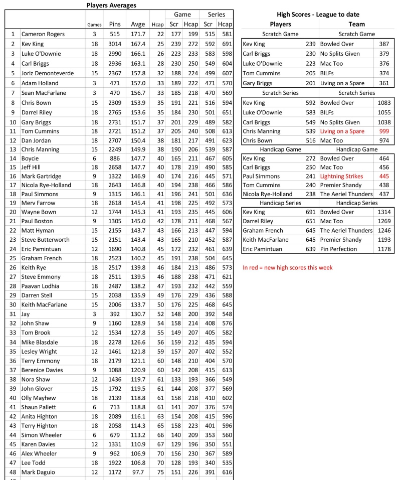 A good win by Lining on a Spare, 12-0 against Young Tigers, moves them up from fourth to second and reduces Bowled Over's lead to six points from ten last week. Lightning Strikes collect 18 points this week with their back match and move up from 14th to 7th. Only one 500 series (515 (581 with handicap) by Cameron in his first match this league) and no 200 games. Wayne had the best game, 193, (235) an improvement of 25 on his previous best this season. |